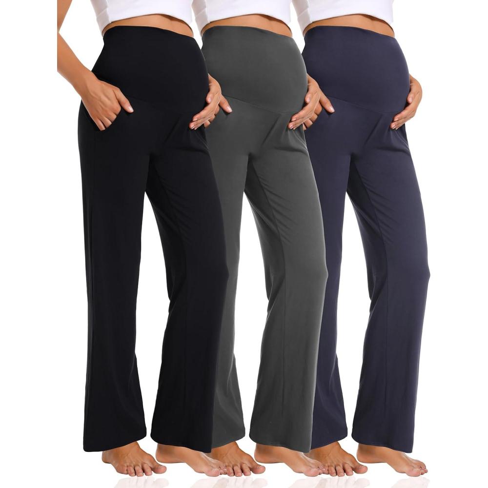 Foucome 3 Pack Maternity Pants Loose Cozy Wide Leg Pants Pregnancy Lounge Yoga Work Trousers with Pockets(Black/Grey/Navy)