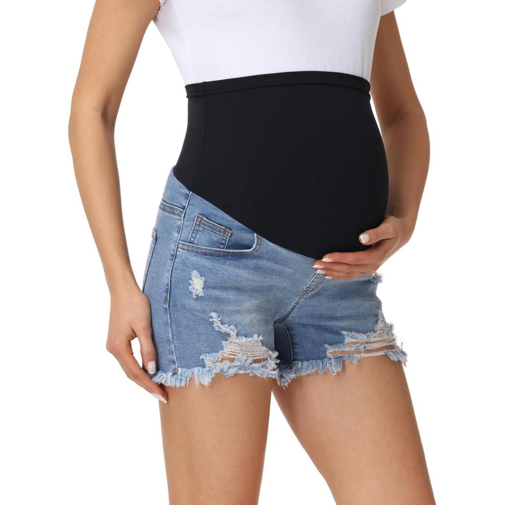 Foucome Maternity Jean Shorts Over Belly Stretchy Ripped Pregnancy Denim Shorts with Pockets(Blue)