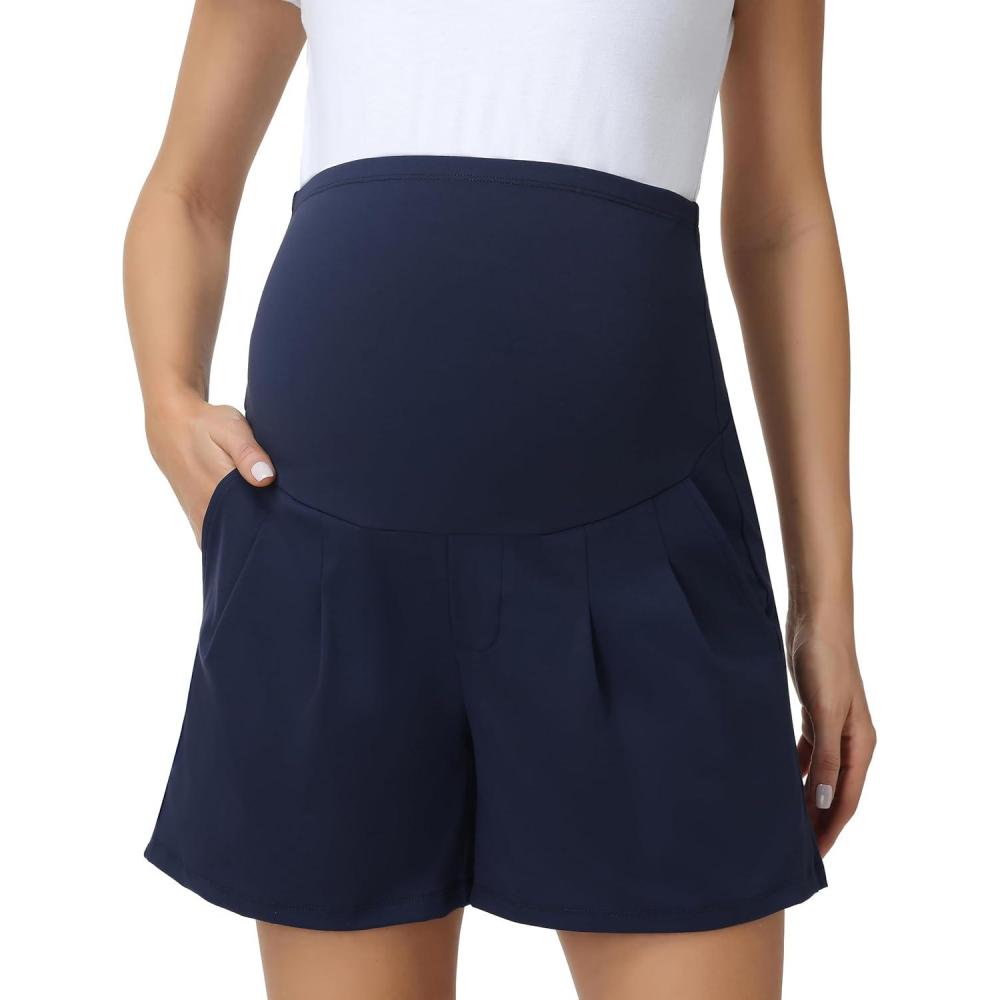 Foucome Women’s Maternity Shorts Wide Leg Pleated Pregnancy Dressy Work Shorts with Pockets(Navy)